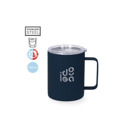 Taza térmica fabricada en acero inox de doble pared y 400 ml de capacidad.