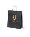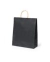 Bolsa de línea nature, fabricada en papel reciclado acabado en negro de 100g/m2, con asas cortas reforzadas en tono natural y fuelle.