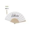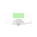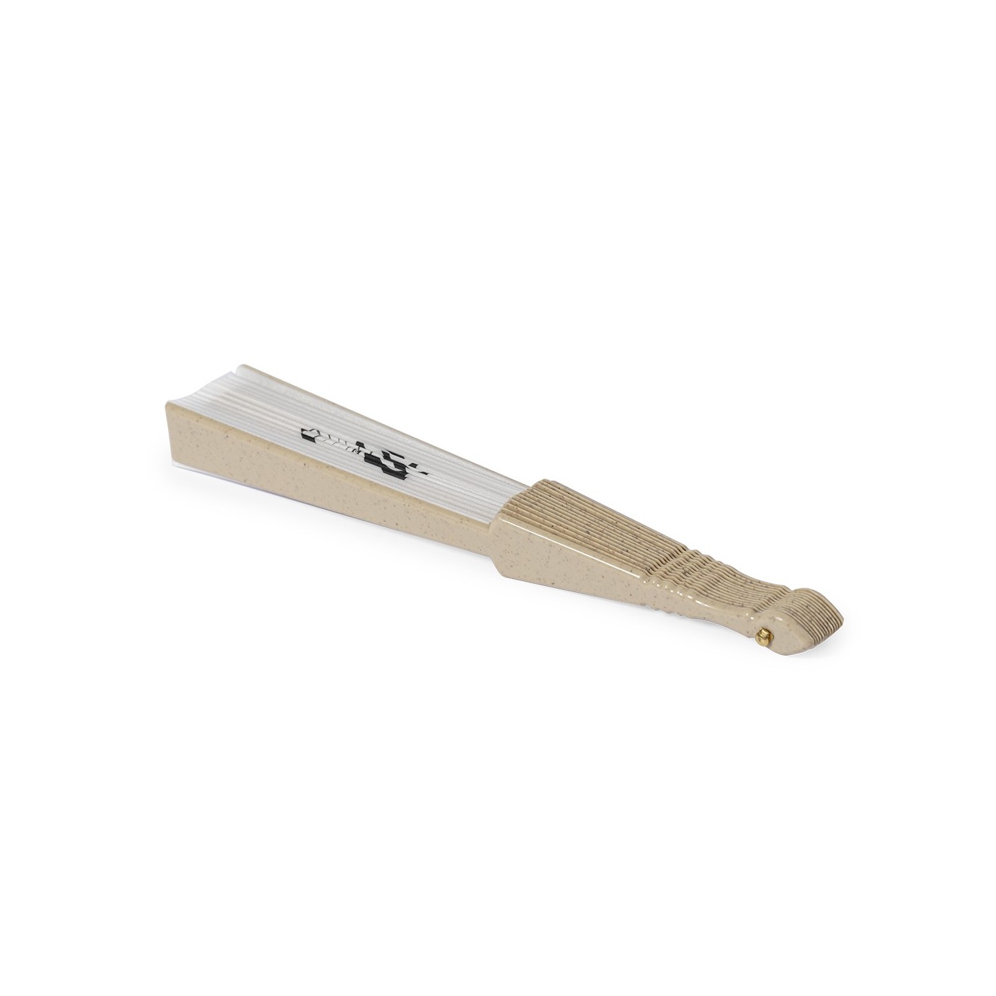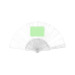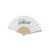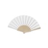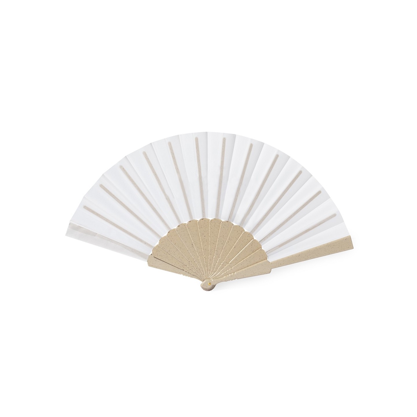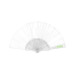 Abanico de línea nature, con varillas de fibra de bambú y tela en RPET, elaborado a partir de plástico reciclado, para así fomentar la reutilización de residuos plásticos y ayudar a la sostenibilidad del planeta.