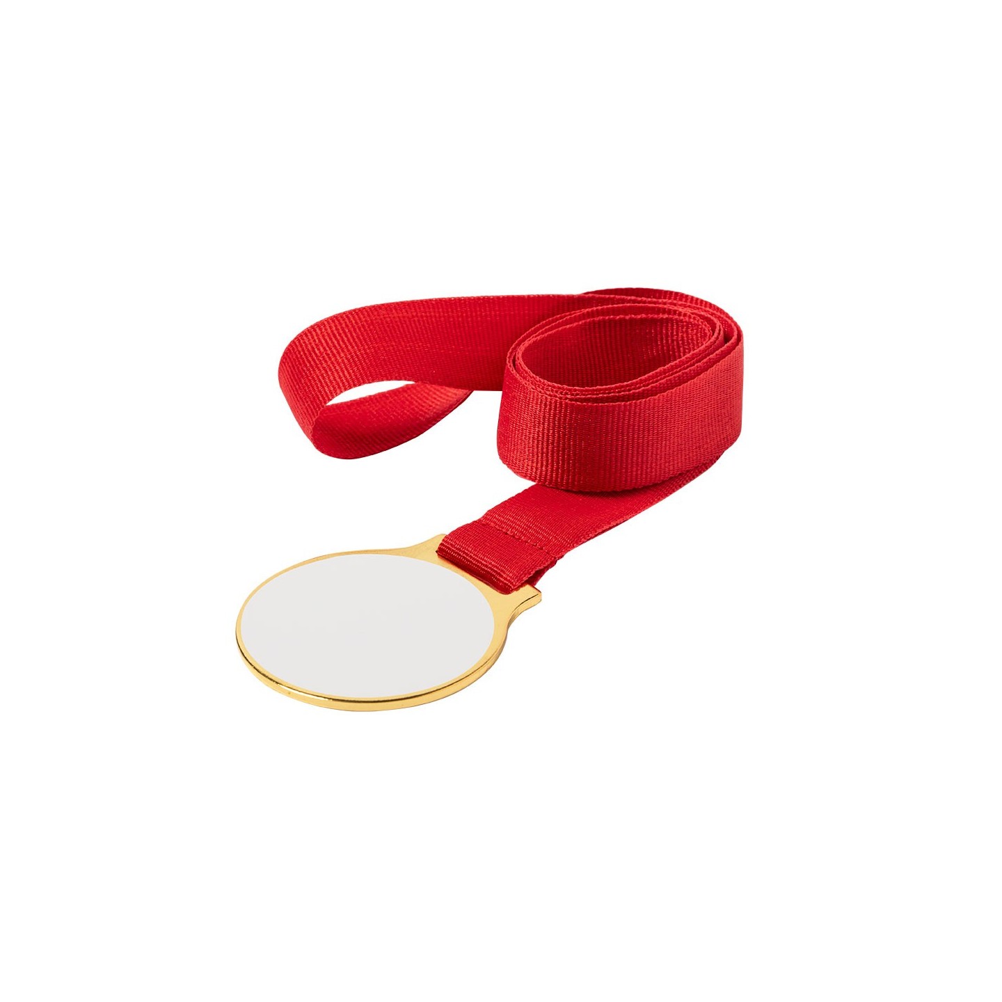 Medalla metálica con acabado dorado liso, especialmente diseñada para marcaje en sublimación (no integrada en el producto, ideal para imprimir y pegar posteriormente).