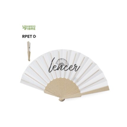 Abanico de línea nature, con varillas de fibra de bambú y tela en RPET, elaborado a partir de plástico reciclado, para así fomentar la reutilización de residuos plásticos y ayudar a la sostenibilidad del planeta.