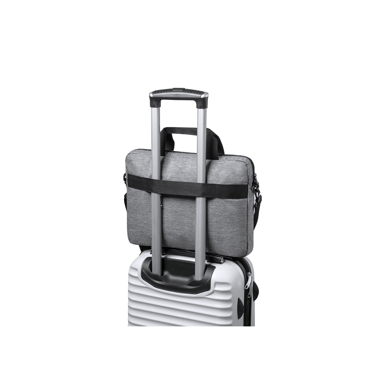 Detalles en negro, incluye compartimentos interiores acolchados para ordenador de hasta 15 pulgadas y tablet de hasta 10 pulgadas. Accesorio en parte posterior para anclaje al trolley, bolsillo exterior con cierre de cremallera, cómodas asas reforzadas, cinta bandolera ajustable con cierre de mosquetón y almohadilla para hombro a juego.