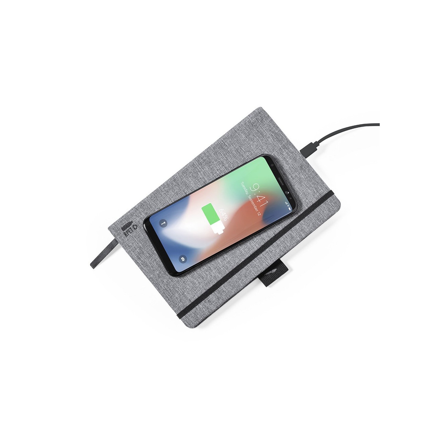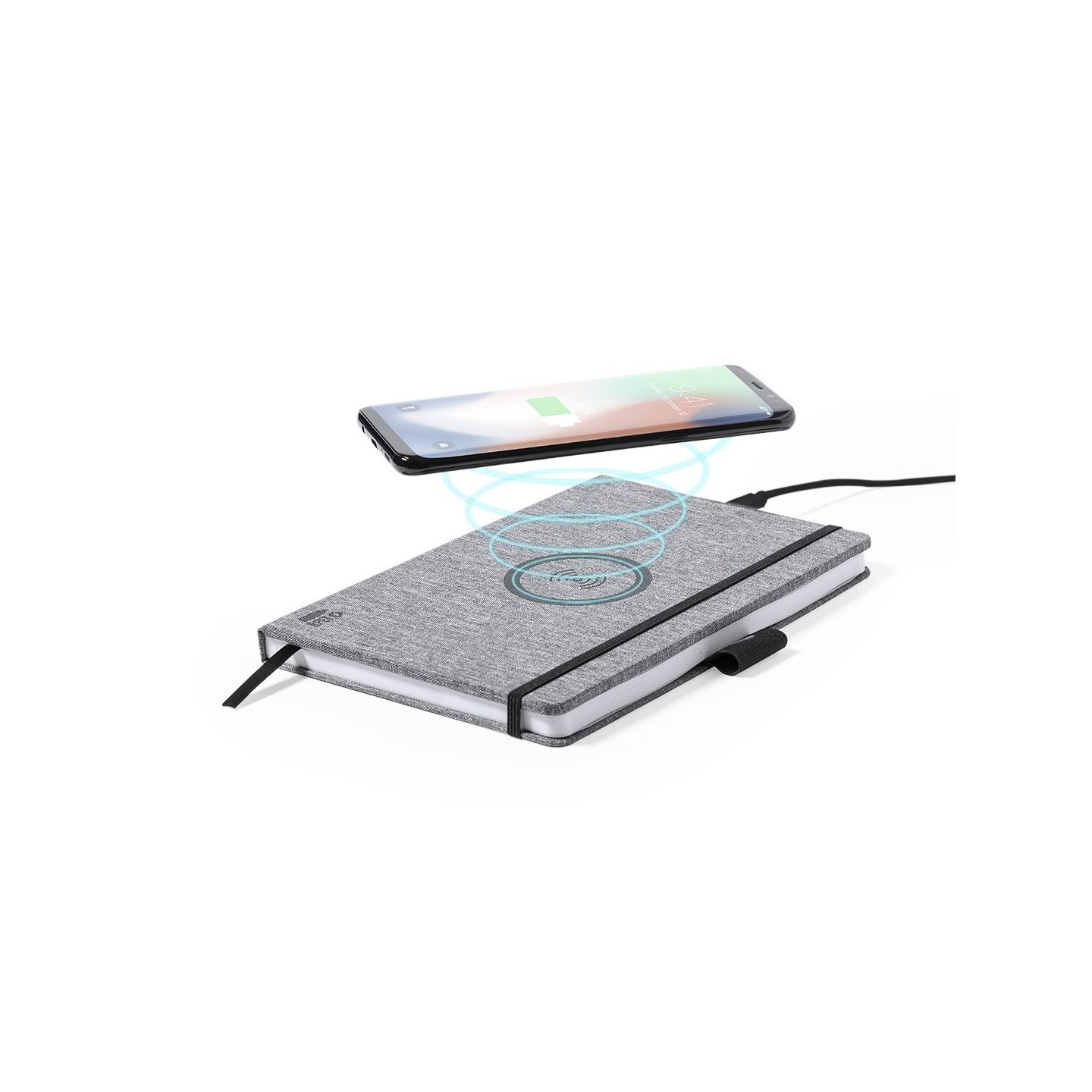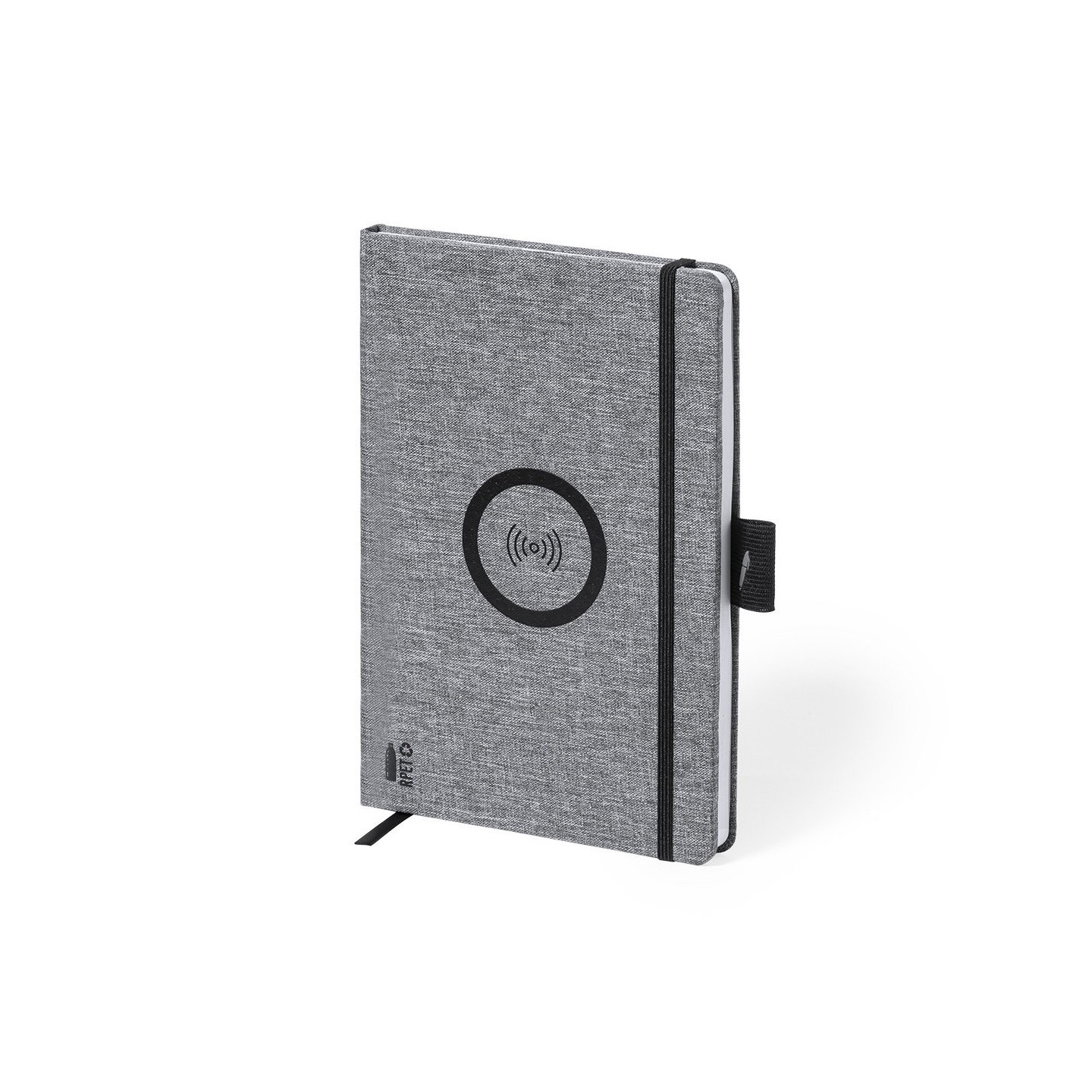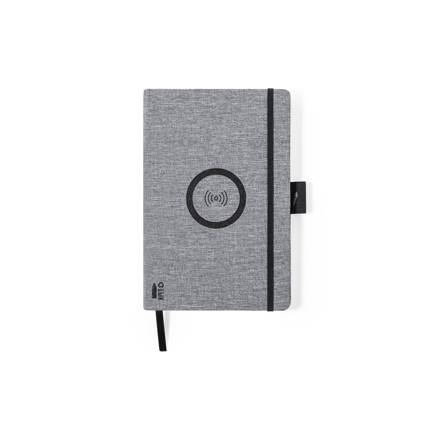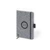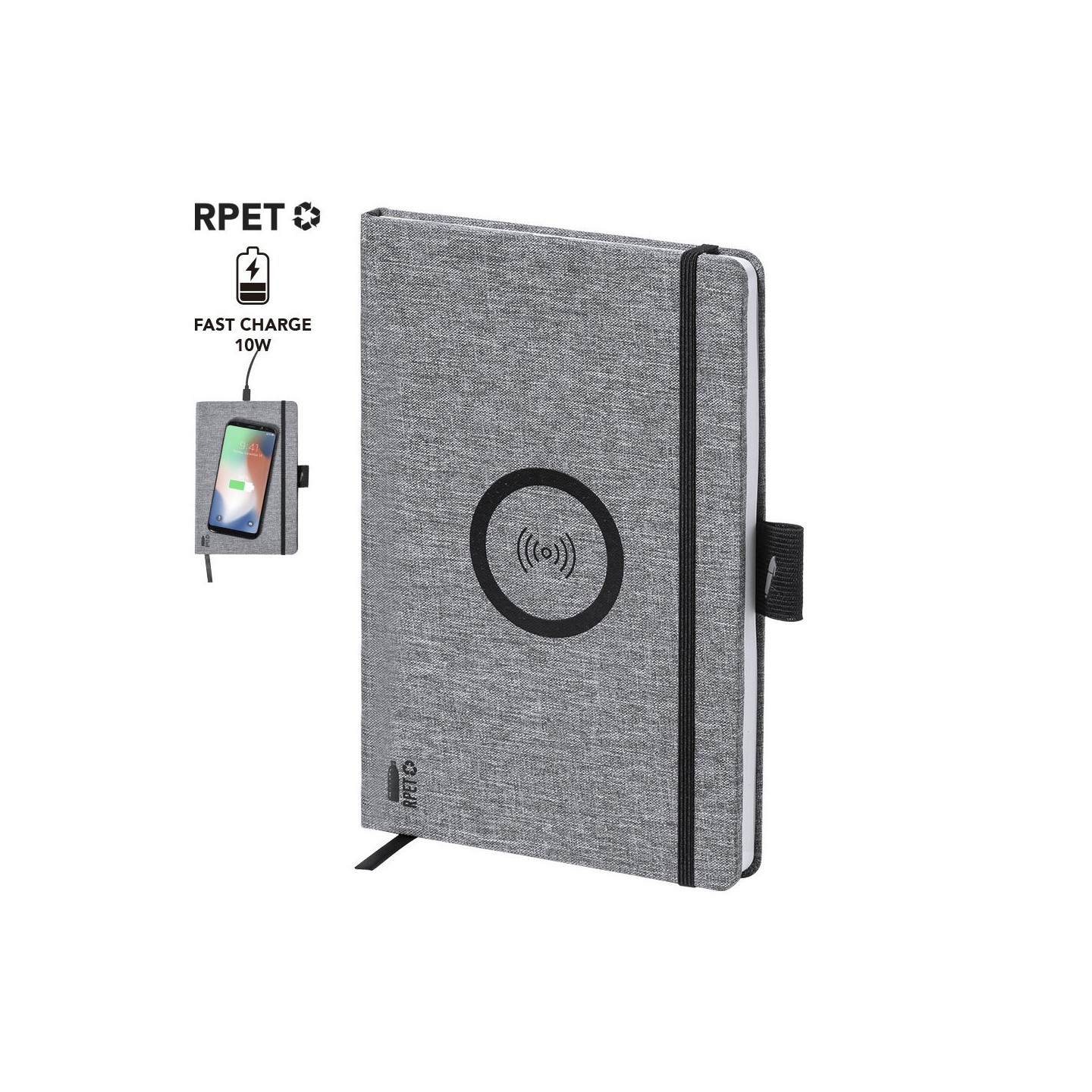 Bloc de notas cargador de línea nature en resistente poliéster 300D RPET de tamaño A5 y elaborado a partir de plástico reciclado, para así fomentar la reutilización de residuos plásticos y ayudar a la sostenibilidad del planeta. Con cargador inalámbrico de 10W integrado en la portada. Incluye 80 hojas con disposición a una raya. Compatible con smartphones con tecnología de carga inalámbrica. Incluido cable de carga Tipo C y disponible manual de instrucciones en español e inglés.
