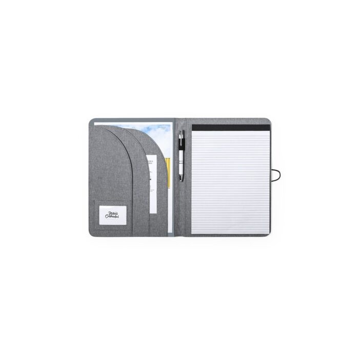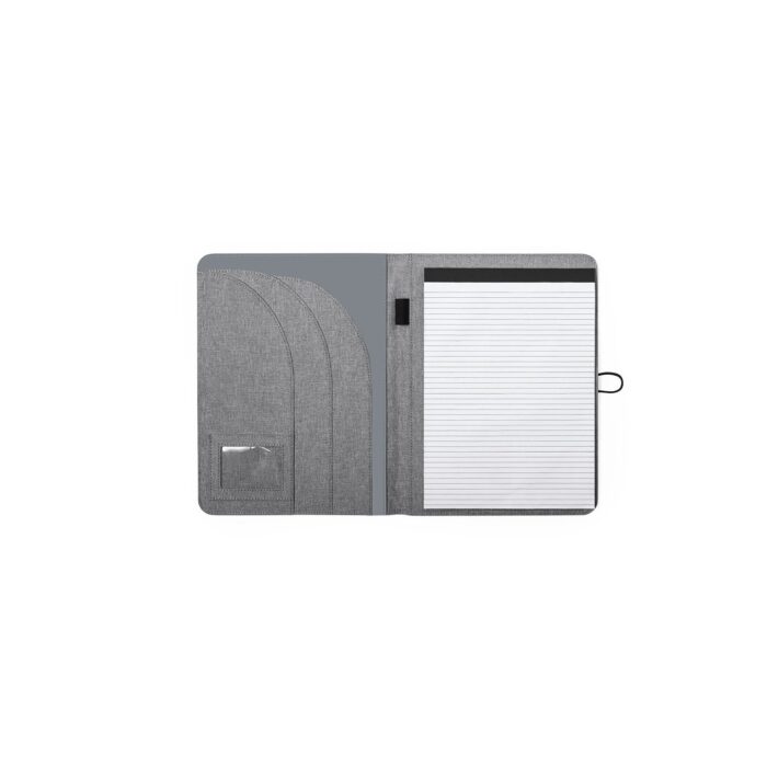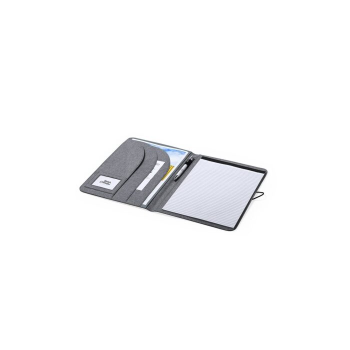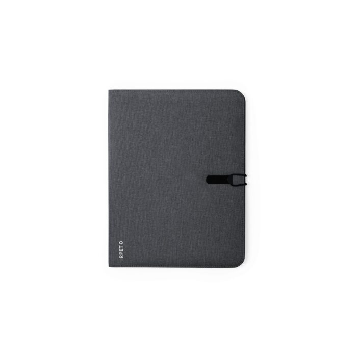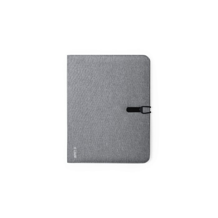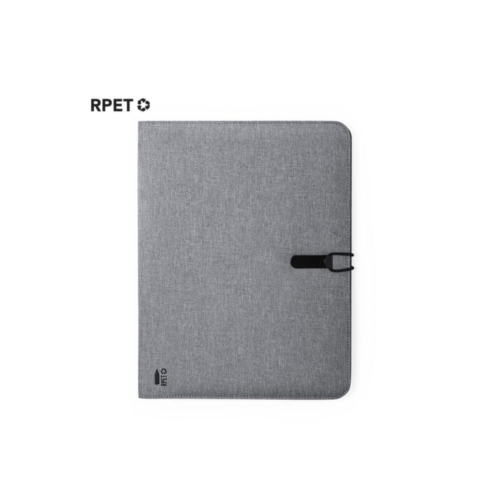 Elegante carpeta de línea nature tamaño A4. Fabricada en resistente 600D RPET efecto melange, elaborado a partir de plástico reciclado para así fomentar la reutilización de residuos plásticos y contribuir a la sostenibilidad del planeta.