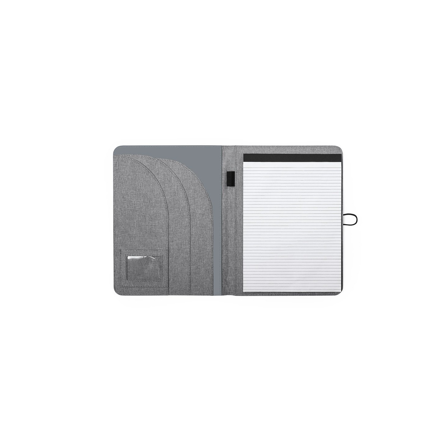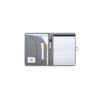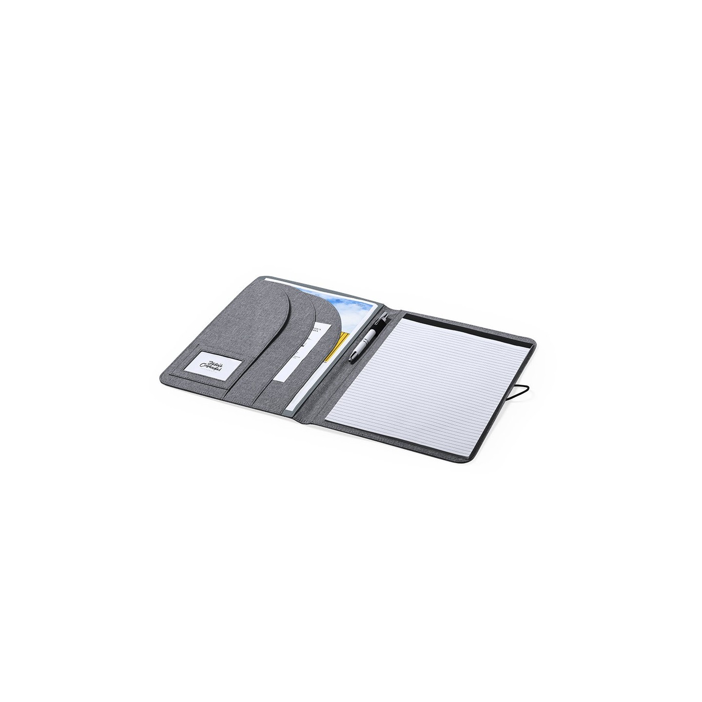 Interior con bloc extraíble de 20 hojas con disposición a una raya, 3 bolsillos de solapa, tarjeteros y soporte para bolígrafo.