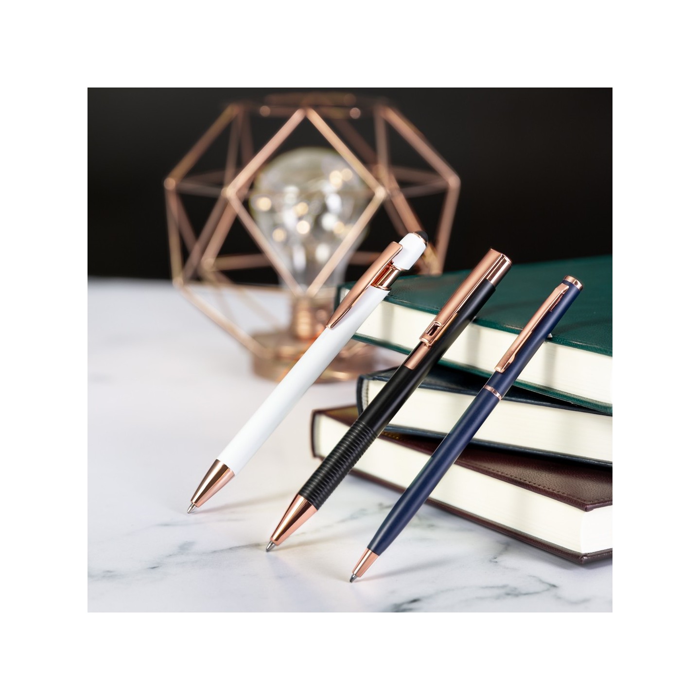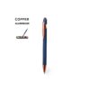 Cuerpo en resistente aluminio de acabado mate con elementos decorativos de elegante acabado color cobre, con la caña en una amplia gama de distintivos colores.
