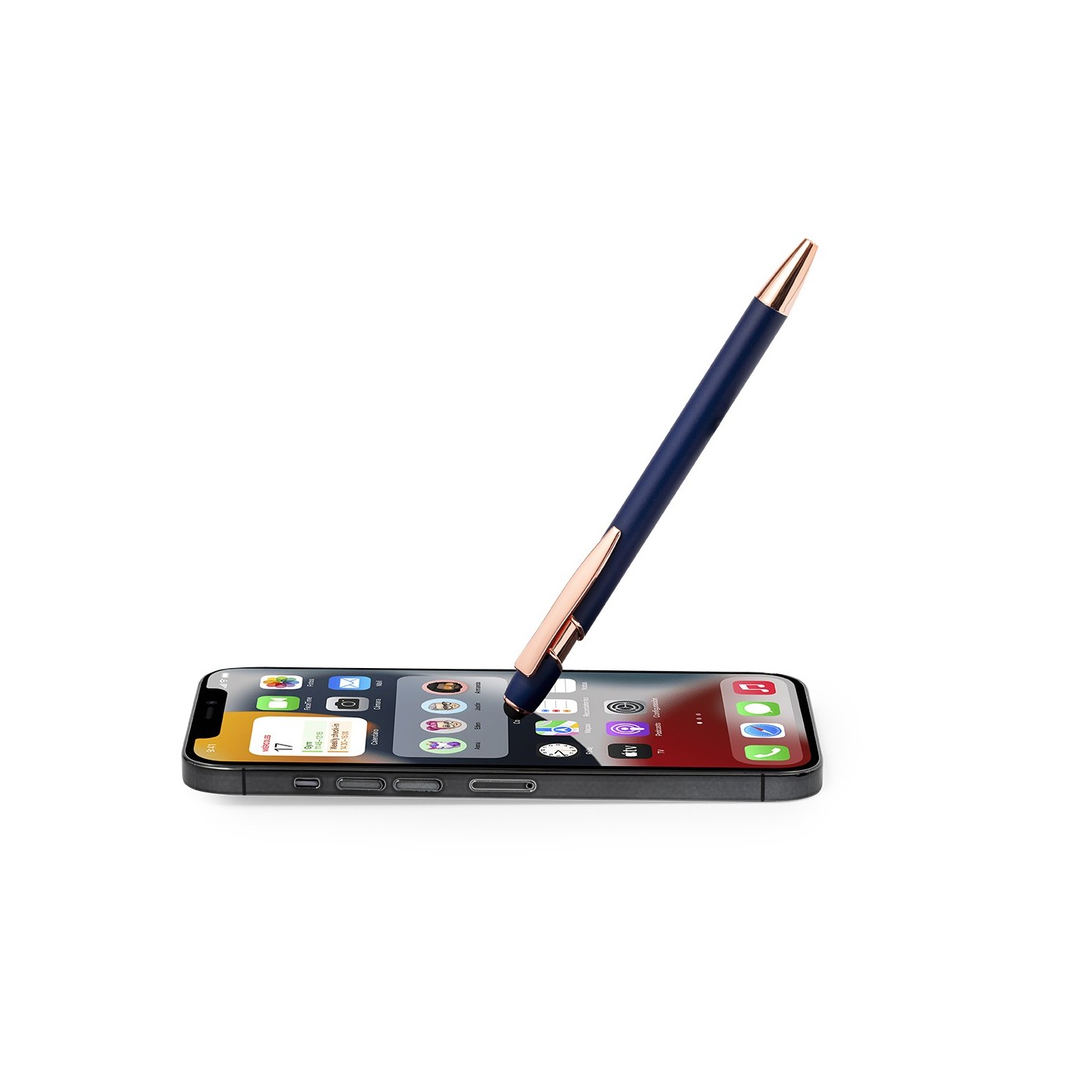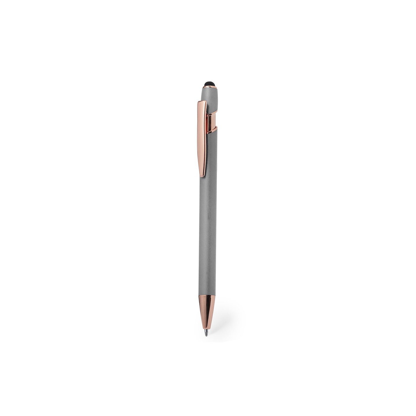 Clip metálico, con pulsador retráctil y puntero negro en la parte superior.