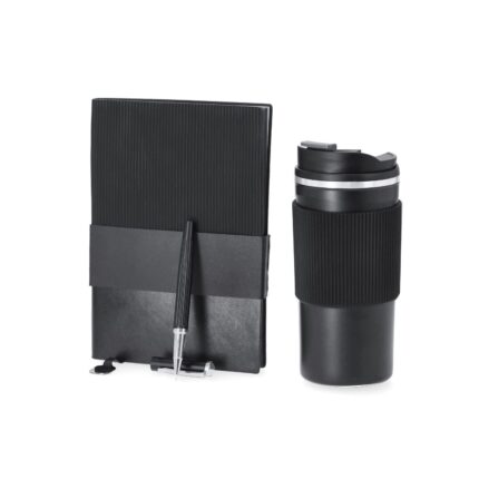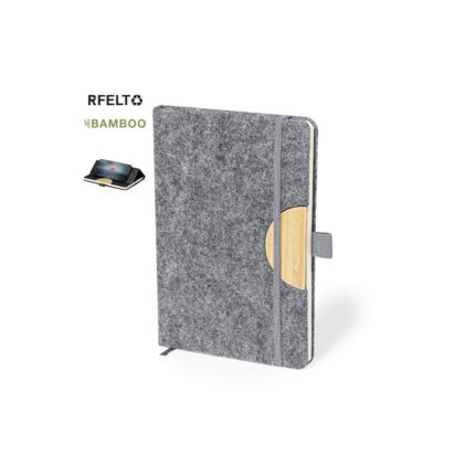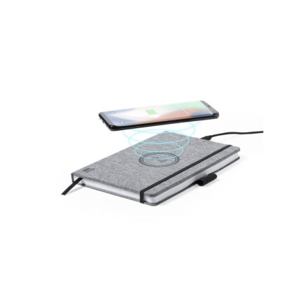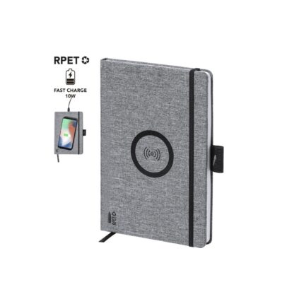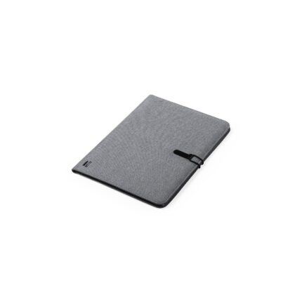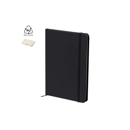 - Bloc de notas con tapas blandas fabricado en elegante PU color negro. Su diseño combina texturas lisas y biseladas. Incluye marcapáginas de tela con accesorio metálico especial para marcaje en láser. Interior con 100 hojas en color crema, de disposición a una raya y bordes en negro.