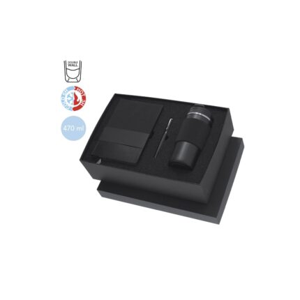 - Vaso térmico fabricado en acero inoxidable de doble pared con capacidad de 470 ml. Con un dosificador en tapadera, libre de BPA, sistema de apertura abre fácil, banda de silicona a juego y base antideslizante.