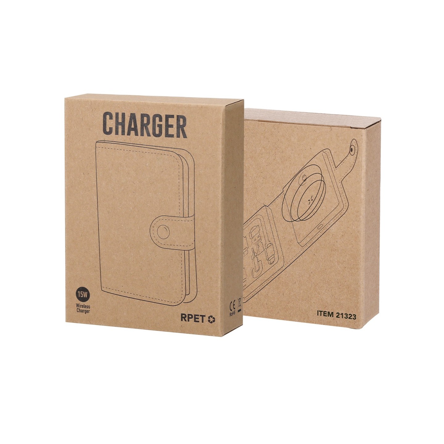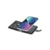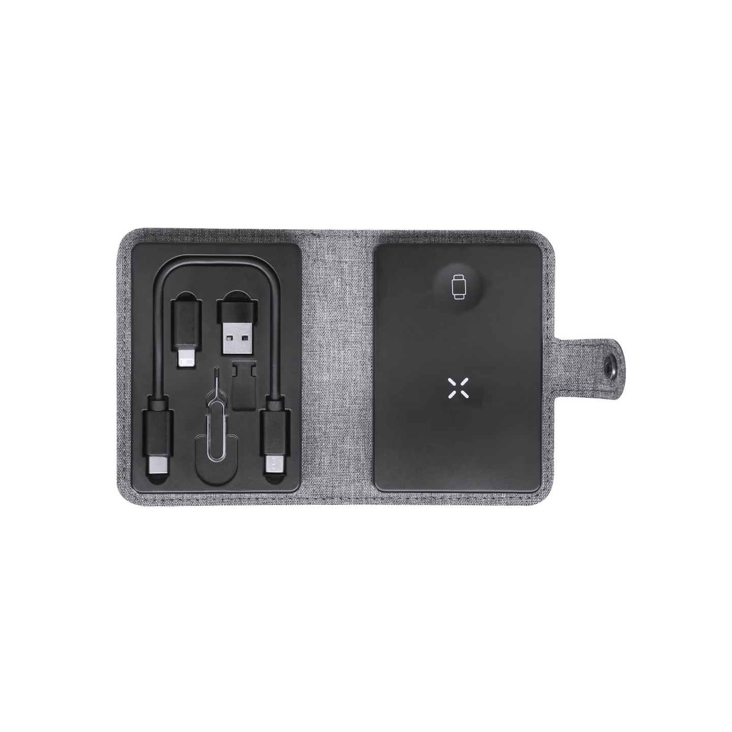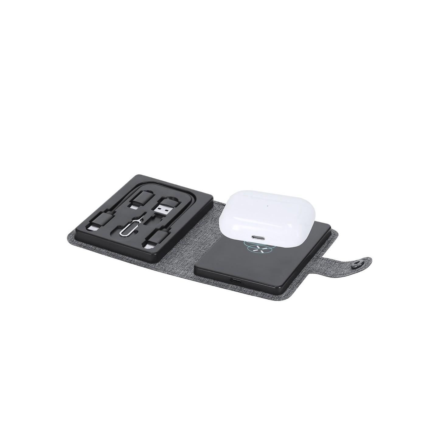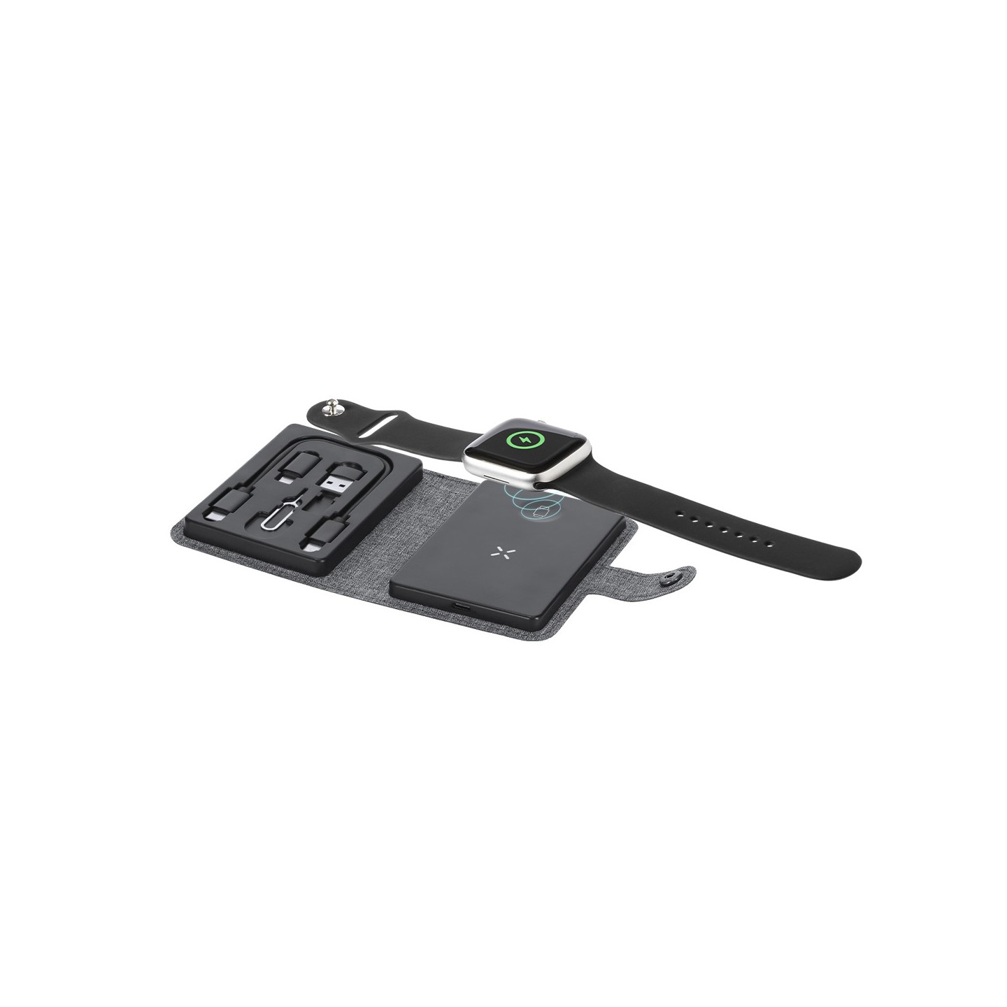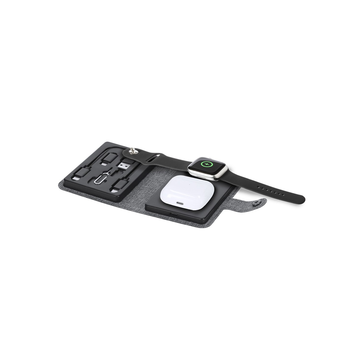 Estuche con cierre de corchete incluyendo base cargadora inalámbrica Qi para smartphone, auriculares y smartwatch.
